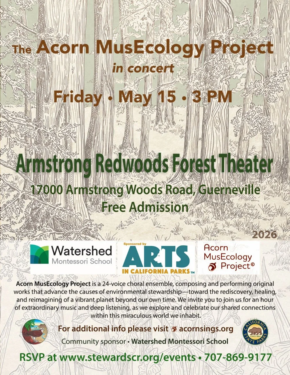 This event is part of a free concert series organized by the Stewards of the Coast and Redwoods in cooperation with California State Parks, Arts in California Parks, performing musicians and the community sponsor: Watershed Montessori School